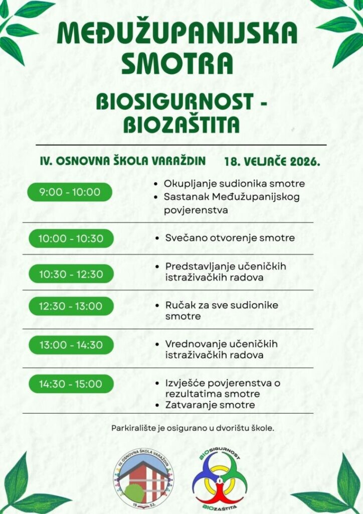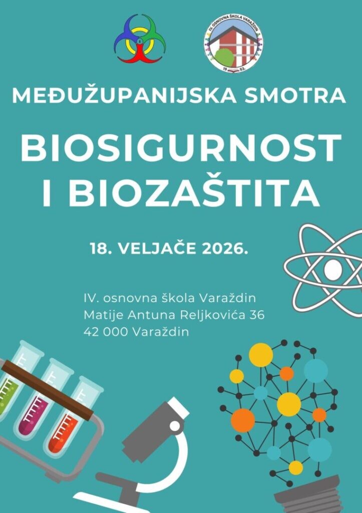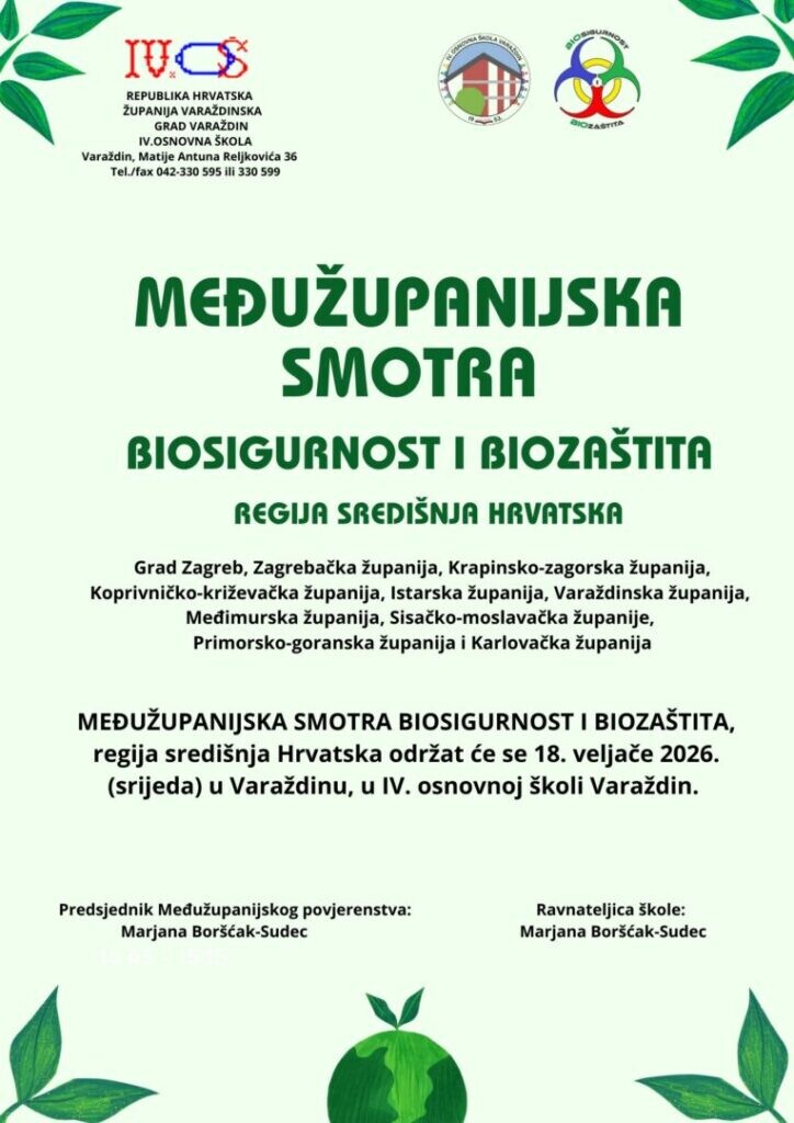 U srijedu, 18. veljače 2026. u IV. osnovnoj školi Varaždin održava se Međužupanijska smotra Biosigurnost i biozaštita (regija središnja Hrvatska) . Svečano otvorenje Smotre bit će u 10h.