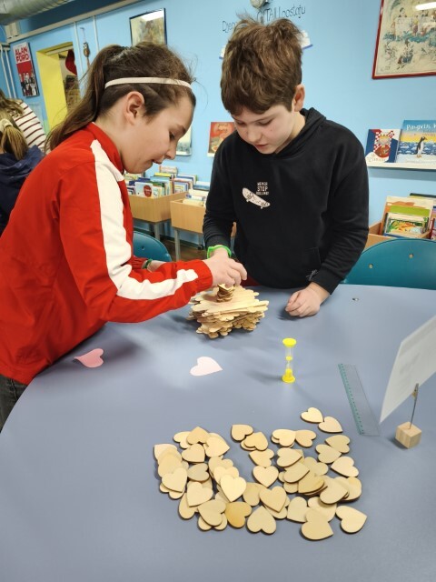 Učenici su se okušali u gradnji tornja koristeći štapiće za sladoled i srca. Bio im je izazov u 3 minute napraviti što višu konstrukciju tornja. Odlično su se snašli i koristili svoje inženjerske vještine!